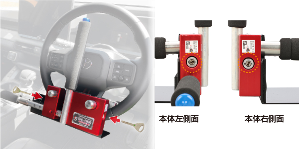 軽自動車から乗用車、高級車、ワンボックス等車種を選ばない! ハンドルのスポーク部分に装着する強固でハンドル破壊防止プレートを備えたハンドル用の回り止めロックです。さらなる使い勝手と強固さ、破壊されにくさを考慮した設計です。 FOR ANY TYPE OF VEHICLE, INCLUDING MINI VEHICLES, PASSENGER CARS, LUXURY CARS, AND ONE-BOX CARS! A NON-ROTATING LOCK FOR STEERING WHEELS WITH A STRONG, ANTI-SMASHING PLATE ATTACHED TO THE SPOKES OF THE STEERING WHEEL. DESIGNED WITH CONSIDERATION FOR FURTHER USABILITY, ROBUSTNESS, AND RESISTANCE TO DESTRUCTION.