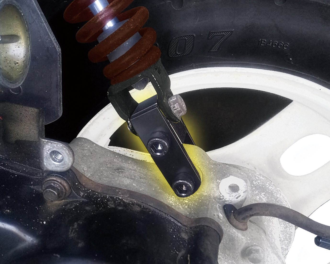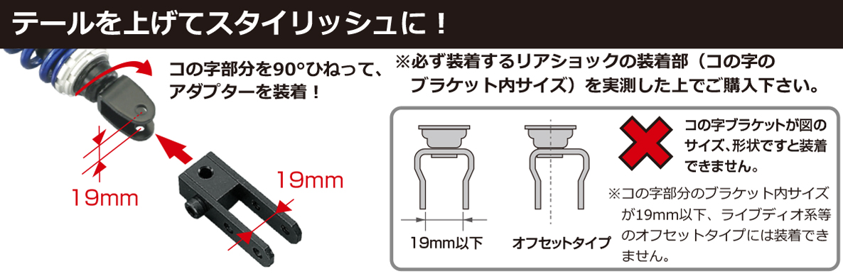必ず装着するリアショックの装着部(コの字部分)を実測した上でご購入下さい。また、装着はリアショックのコの字部分を90°ひねって、アダプターに装着します。