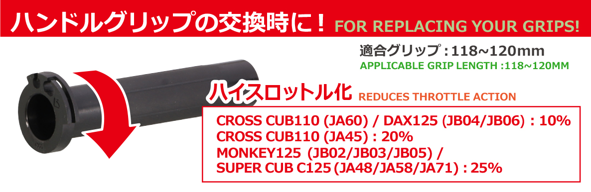 当社のスーパースロットルパイプはアフターパーツのグリップが装着できるように設計した純正同様のスロットルパイプです。使用する際はグリップの同時交換をお勧めします。