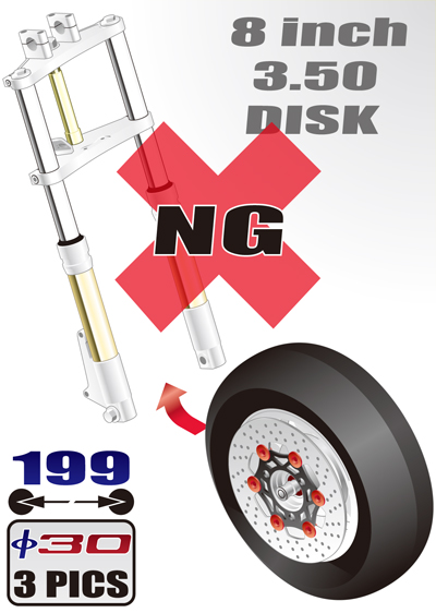 この組み合わせはできません。キャリパーとホイールが干渉します。 THIS COMBINATION NOT POSSIBLE. CALIPER INTERFERES WITH WHEEL.